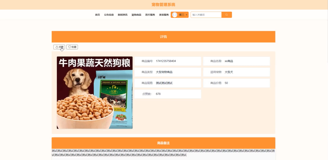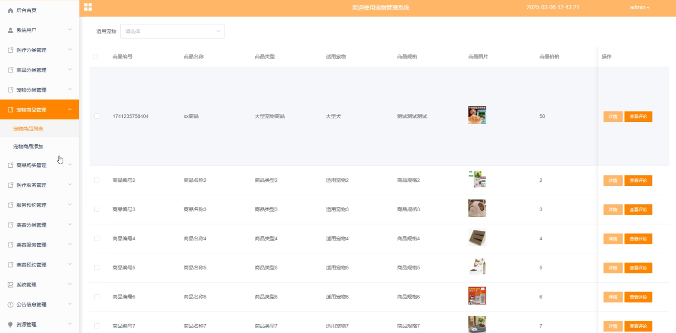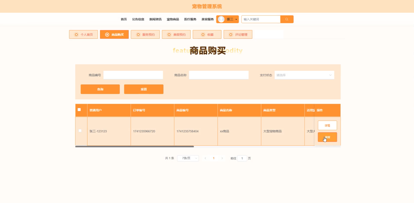 宠物商品:用户可以查看各类宠物商品详情,并进行筛选和购买操作。