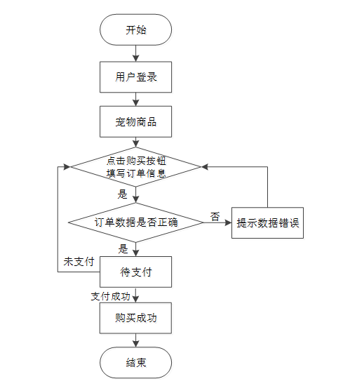 用户在购买宠物商品时,首先通过首页或导航栏进入宠物商品页面,在这里可以根据宠物类型、商品分类等条件筛选出心仪的商品。选定商品后,用户可以查看商品详情,包括规格、价格和用户评价等信息,确认无误后点击购买。在结算过程中,用户需要选择支付方式并完成付款操作。系统会生成订单,并向用户提供订单详情,用户还可以通过个人中心的“商品购买”模块随时查看订单状态。用户购买宠物商品流程图如下图所示。