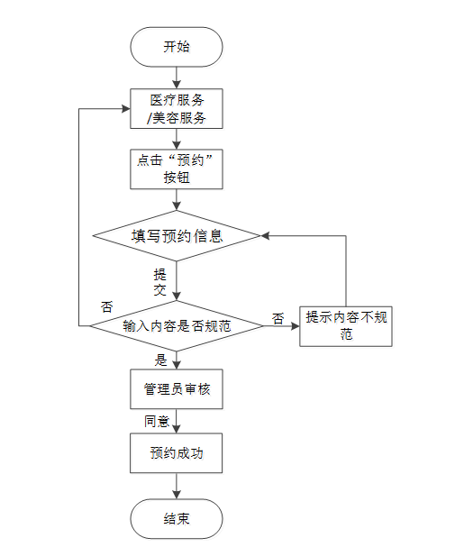 对于医疗或美容服务的预约,用户首先访问相应的服务页面,浏览不同类别的服务项目及其详细内容,如服务名称、适用宠物类型、价格和服务描述等。确定所需服务后,用户选择合适的预约时间,并根据提示填写必要的宠物信息和其他要求。提交预约请求后,系统会发送确认通知给用户,并在后台处理预约请求,确保服务资源的有效分配。用户可以通过个人中心的“服务预约”或“美容预约”模块管理自己的预约记录,包括查看、修改或取消预约。用户预约医疗/美容服务流程图如下图所示。