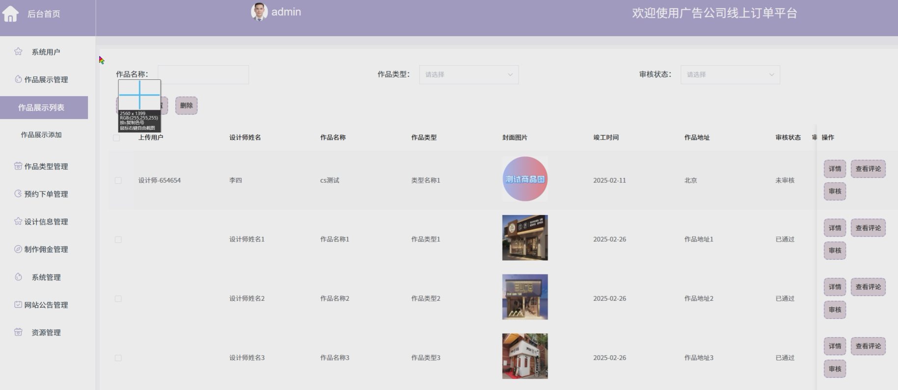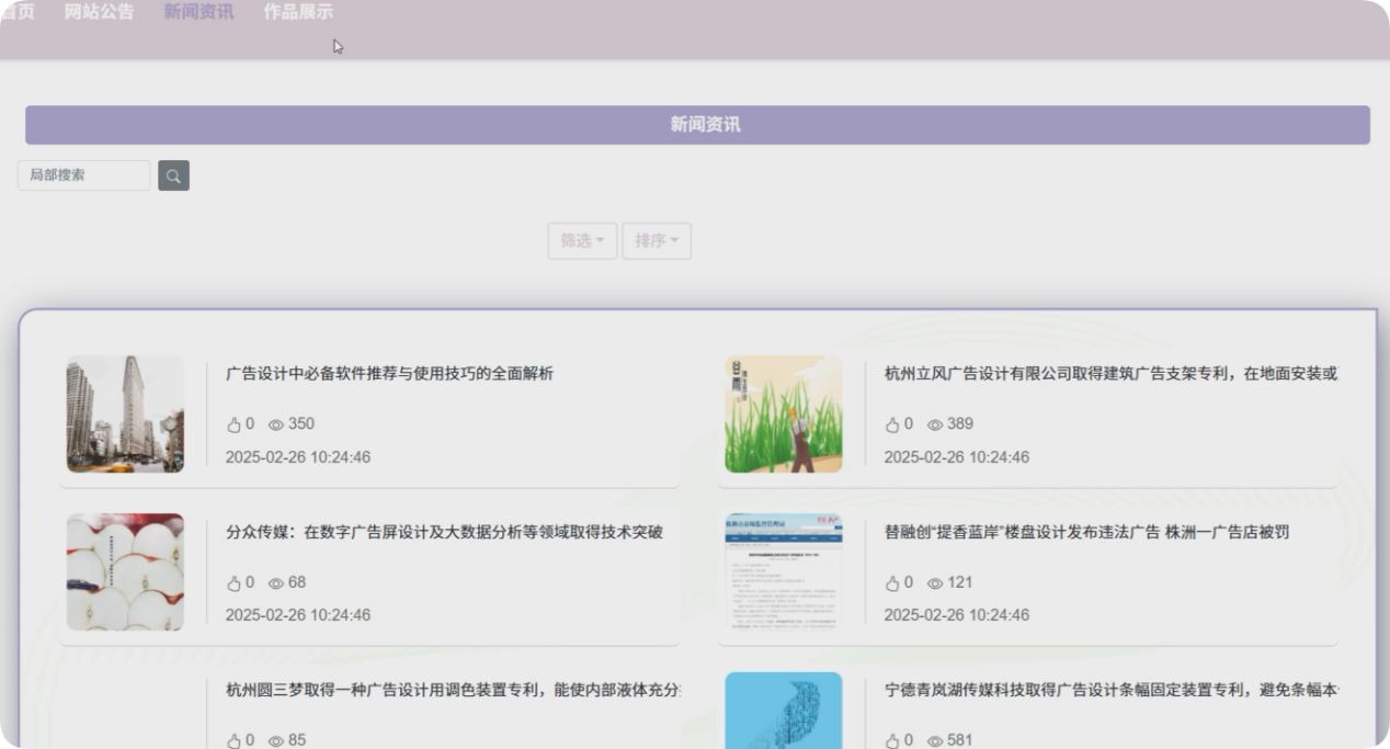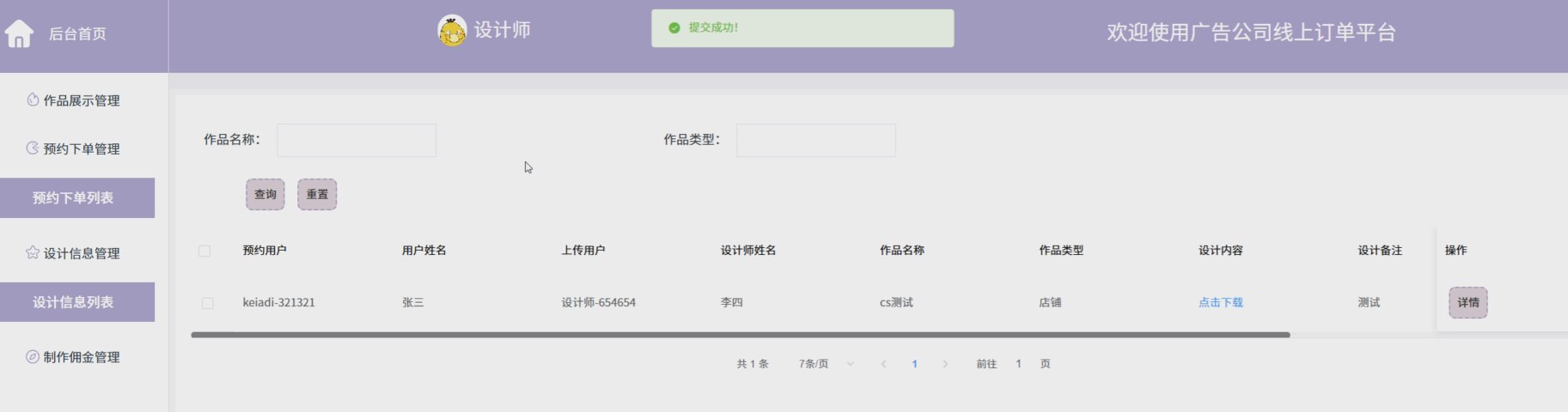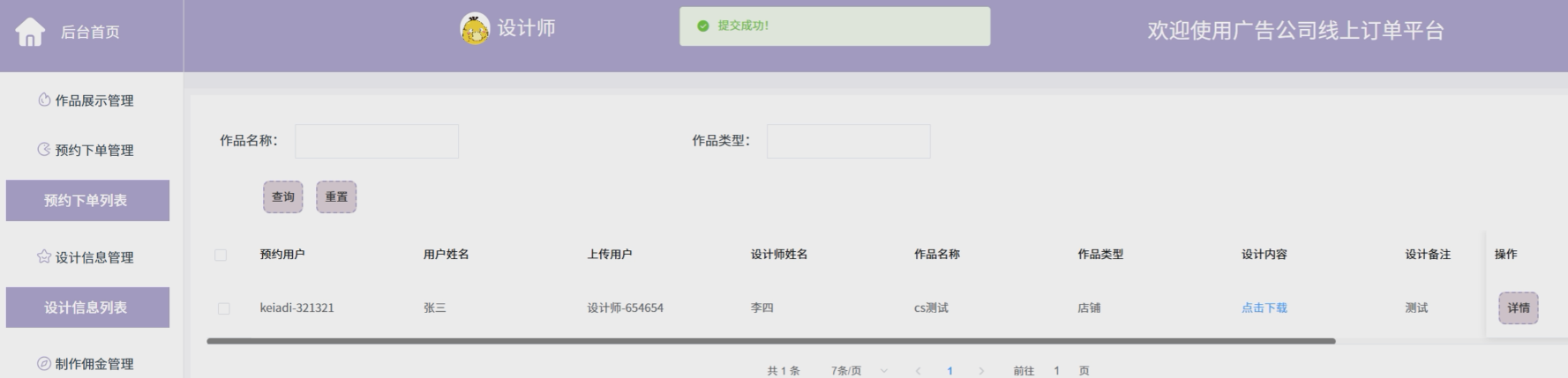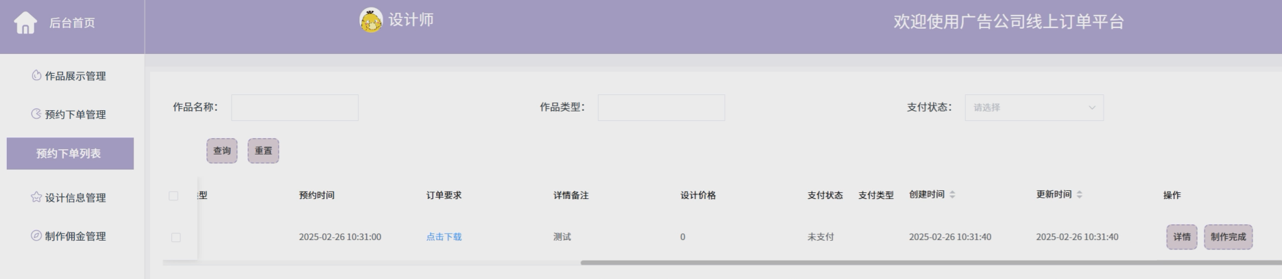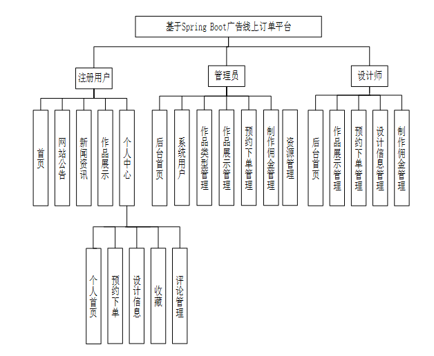 The online order platform of the advertising company is designed based on the Spring Boot framework, providing an integrated solution for the company. The platform ensures the operational independence and system smoothness of users, administrators, and designers through role permission allocation. Registered users can view works, book orders, view design information, comments, etc; Administrators are responsible for user management, work review, and order monitoring; Designers manage the display of works and design information, and view commissions in real-time.
