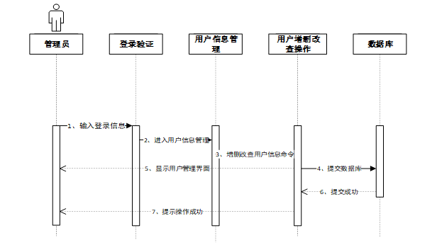 管理员输入登录信息后,进入用户信息管理模块,选择增删改查操作并提交命令至数据库。数据库执行操作后返回成功状态,系统显示用户管理界面并提示操作成功。管理员修改用户信息时序图如图4-5所示。