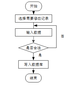 用户首先选择需要修改的记录,输入修改后的数据,系统判断输入数据是否合法。若数据不合法,提示重新输入;若数据合法,则将修改后的数据写入数据库,完成操作后流程结束。修改信息流程图如图3-7所示。