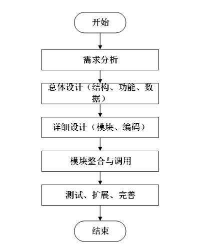 系统开发流程的主要步骤,从需求分析到系统完成的全过程。流程包括需求分析、总体设计(结构、功能、数据)、详细设计(模块、编码)、模块整合与调用,以及测试、扩展和完善,最终完成系统的开发。本系统的开发流程如图3-3所示