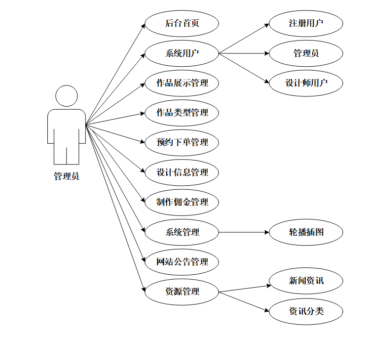 管理员可管理后台首页、系统用户(注册用户、管理员、设计员用户)、作品展示管理、作品类型管理、预约下单管理、设计信息管理、制作佣金管理、系统管理(轮播插图管理)、网站公告管理、资源管理(新闻资讯 资讯分类)