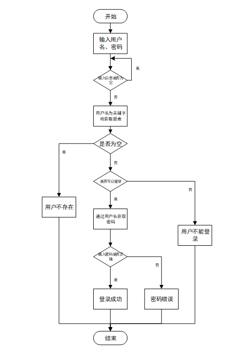 用户输入用户名和密码后,系统先检查输入是否为空,再验证用户名是否存在,若存在则通过用户名获取密码并校验。若密码正确则登录成功,否则提示密码错误。若用户名不存在或无法登录,提示用户操作无效。如图3-4所示。