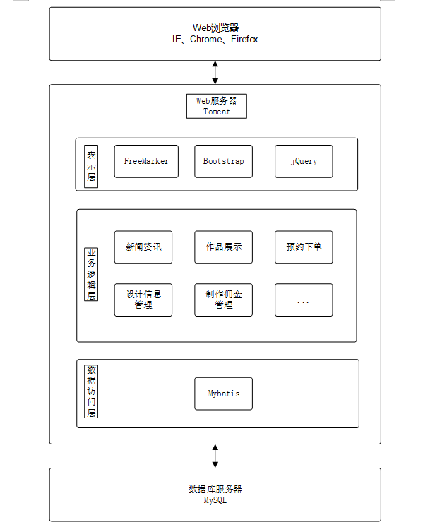 系统由表现层、业务逻辑层、数据访问层和数据库服务器组成。表现层通过浏览器(如IE、Chrome、Firefox)与用户交互,采用FreeMarker、Bootstrap、jQuery等技术实现界面呈现。业务逻辑层负责处理系统的核心业务逻辑,通过分模块设计实现功能分离。数据访问层使用MyBatis框架连接数据库,执行数据的增删改查操作。数据库服务器采用MySQL进行数据存储和管理,为系统提供稳定的数据库支持。整个架构通过Tomcat服务器完成用户请求的接收和处理,确保系统的高效运行[8]。整个系统架构如图4-1所示。