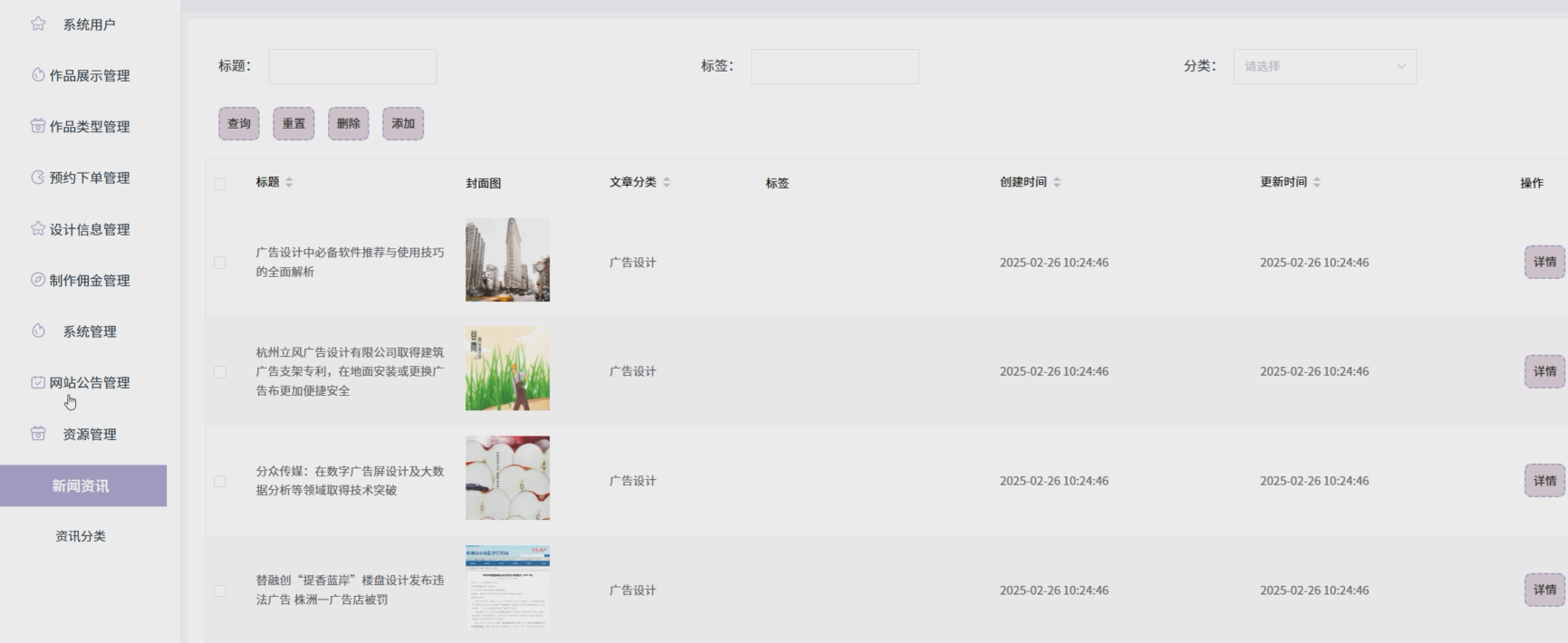 管理员在资源管理页面查看所有新闻资讯,支持新增、编辑和删除操作。点击“新增”填写标题、内容并上传图片,选择分类后发布。可批量删除过期文章。新闻资讯界面如图5-6所示。