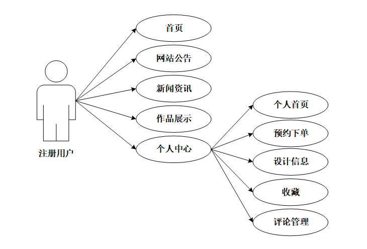 注册用户可查看首页、网站公告(网站公告 关于我们 联系方式)网站介绍、新闻资讯、作品展示、我的账户、个人中心:(个人首页、预约下单、设计信息、收藏、评论管理)。