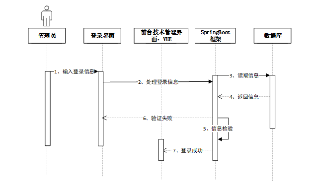 管理员输入登录信息后,登录界面将信息传递至前台管理界面,随后通过SpringBoot框架读取数据库中的用户信息并返回。系统验证信息,若验证成功则登录成功,若验证失败则返回错误提示。登录时序图如图4-4所示。
