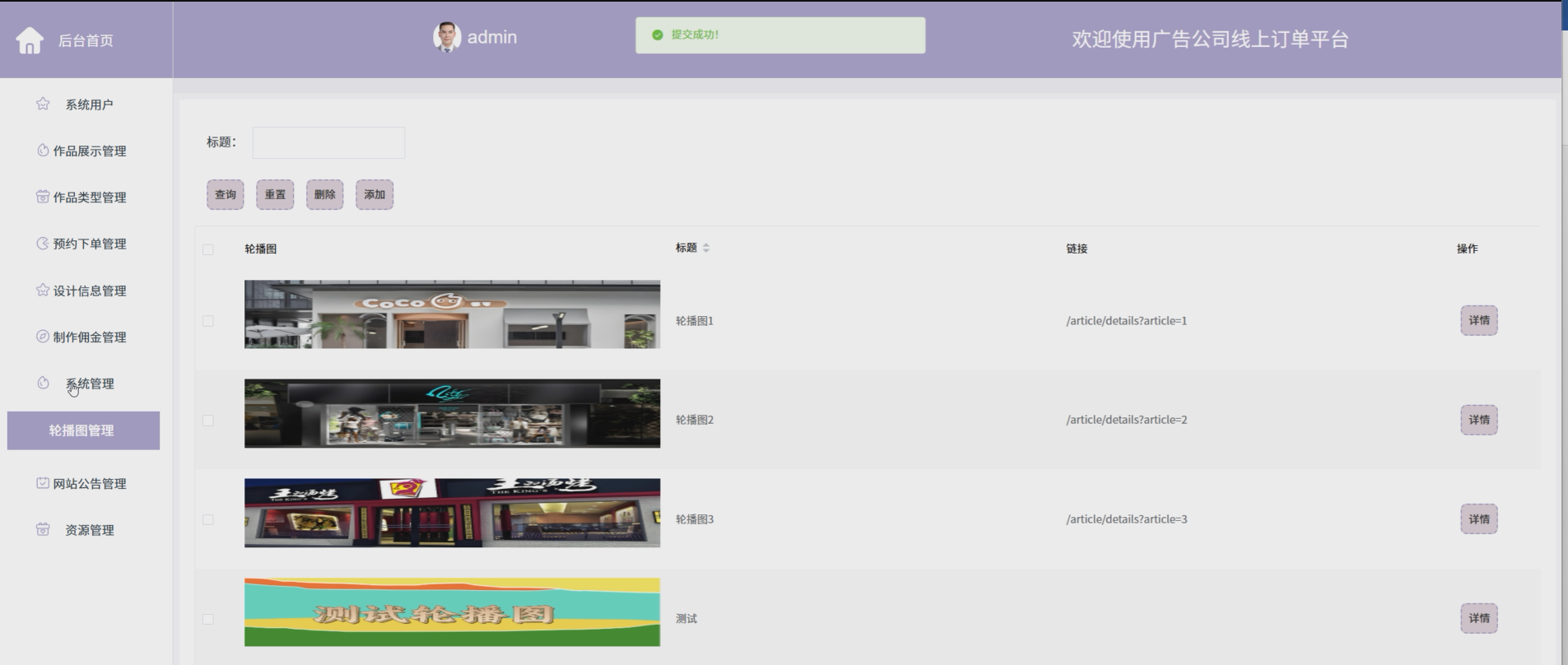 管理员在系统管理页面可查看、添加、删除轮播插图。系统管理界面如图5-8所示。