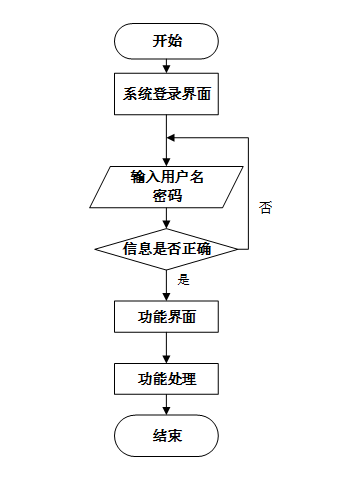 用户首先进入系统登录界面,输入用户名和密码后,系统验证信息是否正确。若验证失败,返回登录界面重新输入;若验证成功,则进入功能界面,执行相应功能处理后结束操作流程。操作流程如图3-5所示。