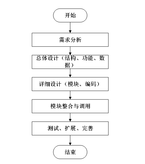 系统开发流程的主要步骤,从需求分析到系统完成的全过程。流程包括需求分析、总体设计(结构、功能、数据)、详细设计(模块、编码)、模块整合与调用,以及测试、扩展和完善,最终完成系统的开发。本系统的开发流程如图所示