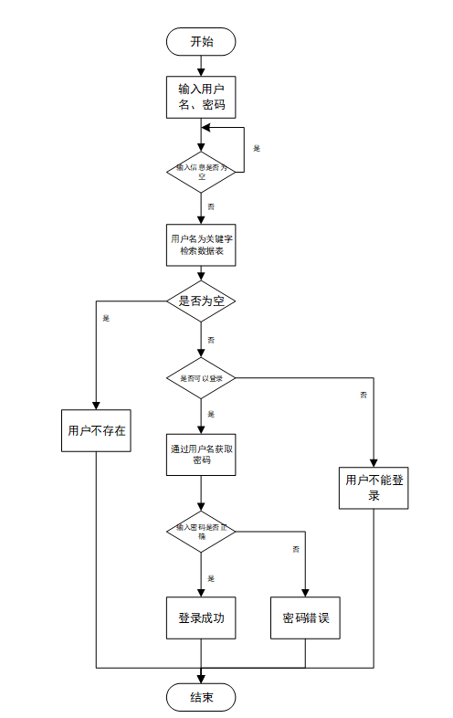 用户输入用户名和密码后,系统先检查输入是否为空,再验证用户名是否存在,若存在则通过用户名获取密码并校验。若密码正确则登录成功,否则提示密码错误。若用户名不存在或无法登录,提示用户操作无效。如图所示。