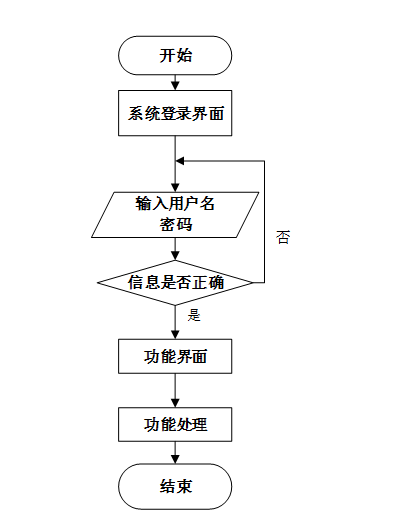 用户首先进入系统登录界面,输入用户名和密码后,系统验证信息是否正确。若验证失败,返回登录界面重新输入;若验证成功,则进入功能界面,执行相应功能处理后结束操作流程。操作流程如图所示。