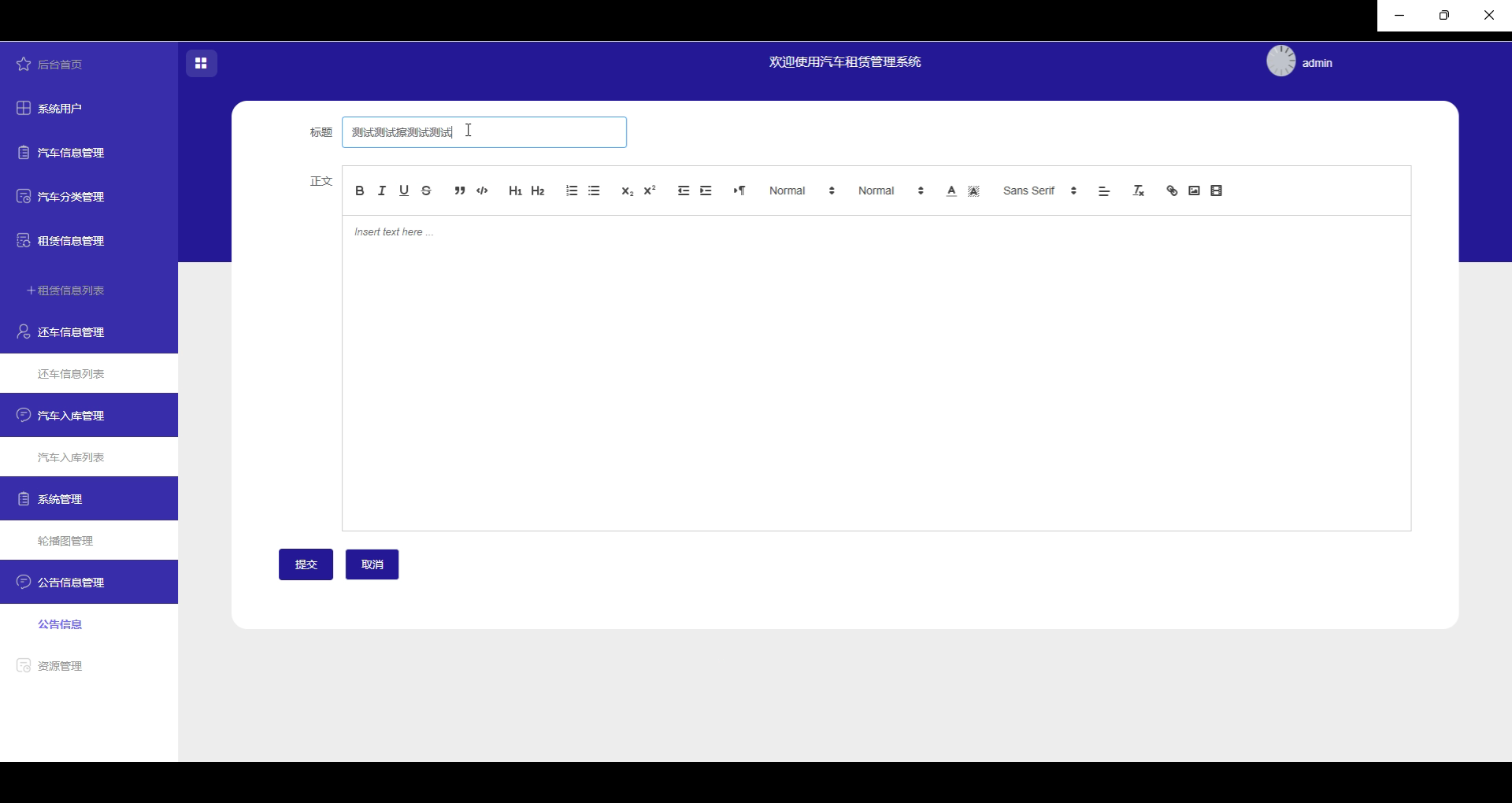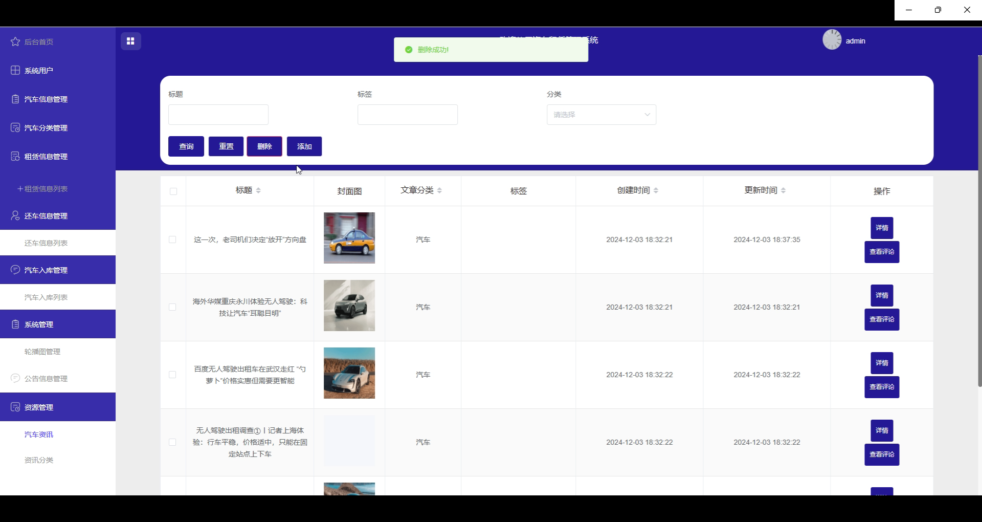 汽车信息管理:管理员可以通过系统高效地添加、编辑和删除汽车信息,并对车辆进行分类管理,确保信息的准确性和及时更新,为用户提供最新的汽车租赁选择。