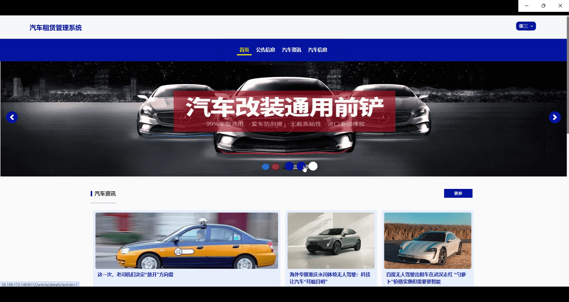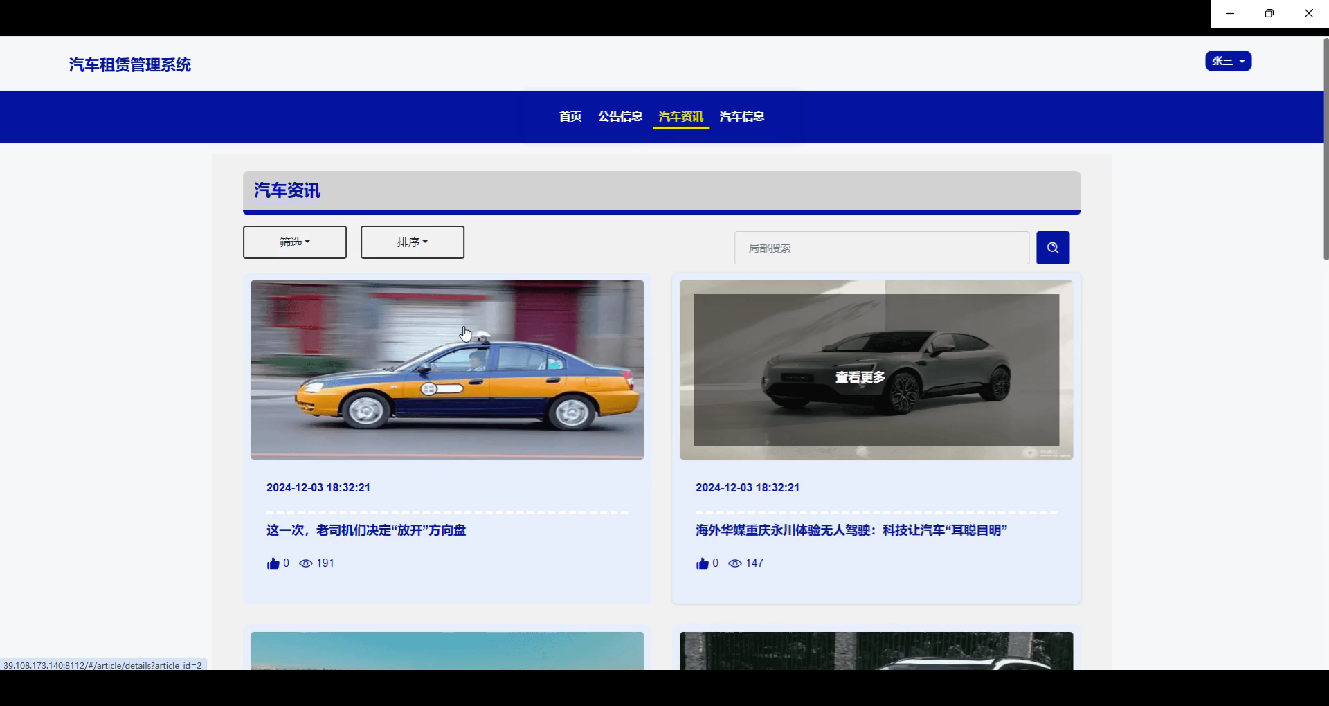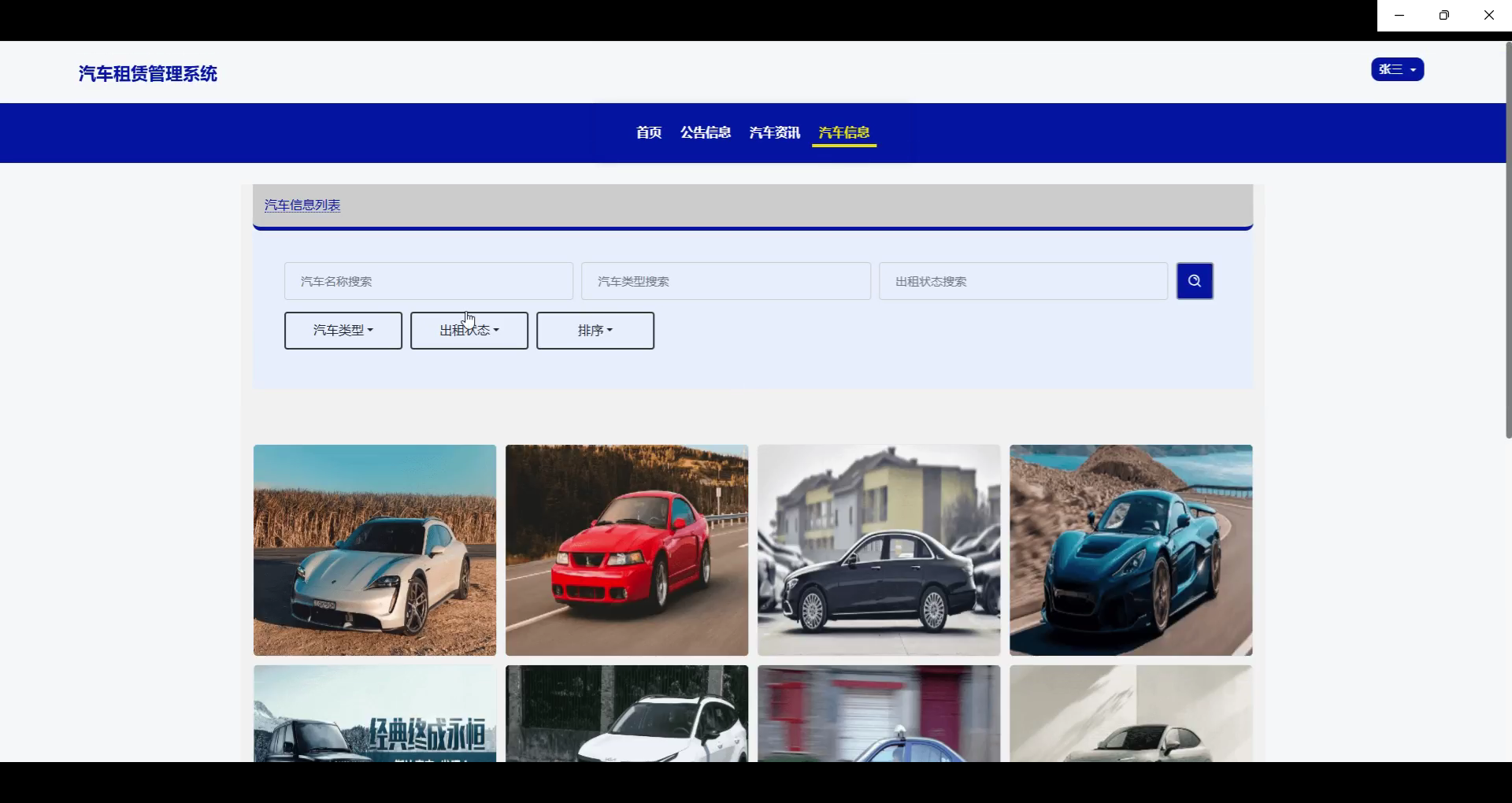 With the development of the sharing economy, the demand for car rental market is increasing day by day. In order to meet the needs of users for convenient car rental and improve the efficiency of rental management, it is particularly important to develop an Internet based car rental management system. The system is divided into three main roles: tenant, tenant, and administrator. Tenants can browse car information, view announcement information, rent cars, and manage personal rental records; Rental users can add rental cars, review rental applications, manage return information, etc; Administrators are responsible for comprehensive management of various information in the system, including user management, vehicle classification management, and announcement information release.