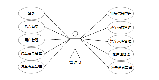 管理员拥有最高权限,能够全面管理系统的各个方面,包括用户管理、汽车信息及其分类管理、租赁与还车信息处理、轮播图及公告信息发布等。管理员的工作确保了平台的正常运行,为承租用户和租赁用户提供稳定可靠的服务支持。管理员角色用例如下图所示。