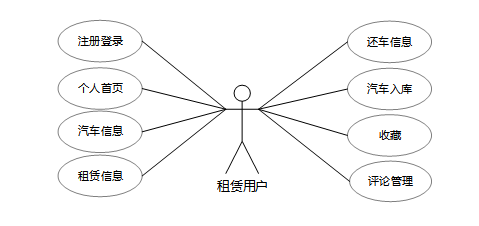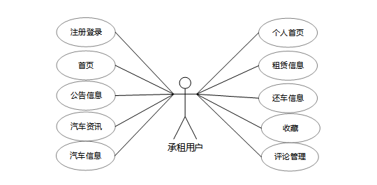 承租用户可以通过系统浏览各类可租赁汽车,查看详细的汽车资讯和公告信息,并进行租赁申请。个人中心提供了便捷的租赁管理功能,包括查看租赁记录、还车状态、收藏喜爱的汽车以及管理评论等。承租用户角色用例如下图所示。