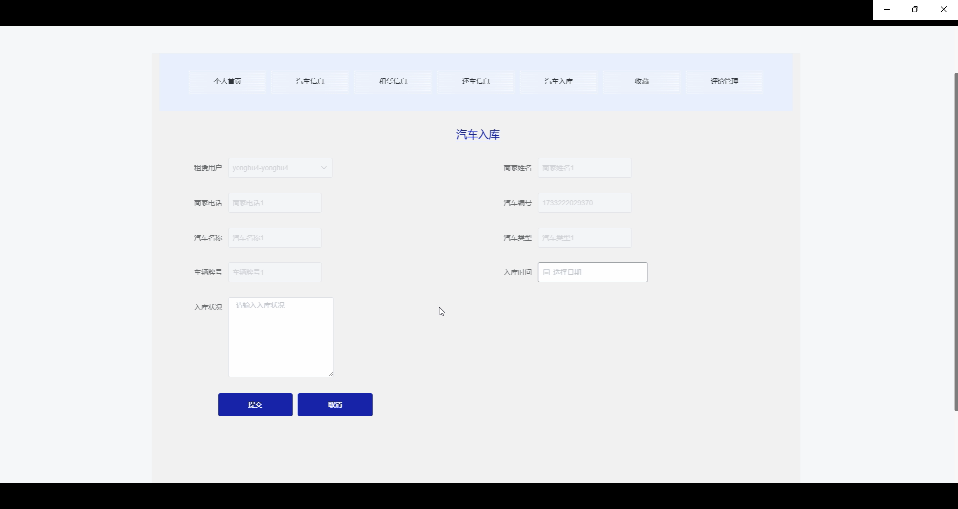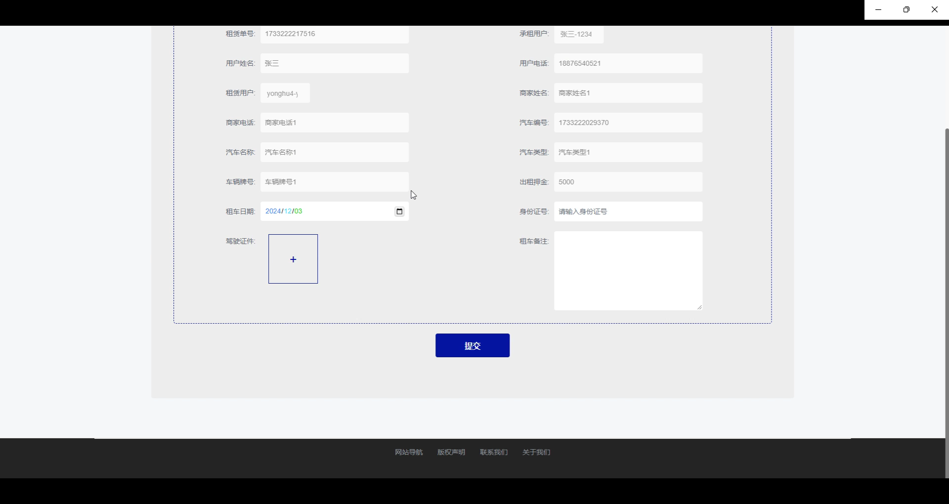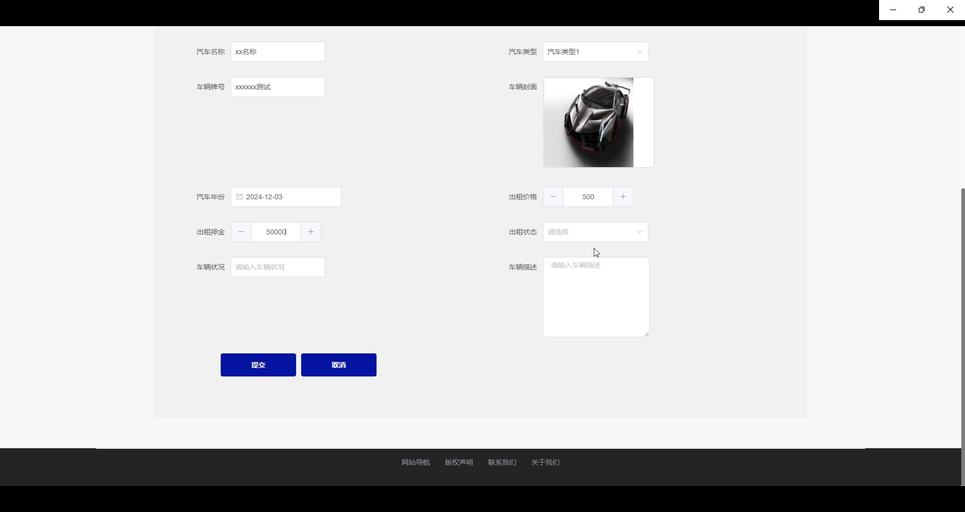 在添加可出租汽车时,CarAddController负责接收用户提交的信息,并调用CarAddService层的addNewCar方法将新车辆信息存入数据库。前端页面使用Vue.js表单组件收集车辆详情(如型号、租金、可用时间段等),用户填写完毕后点击提交按钮,系统验证数据完整性并提示成功与否。界面图如下所示。
