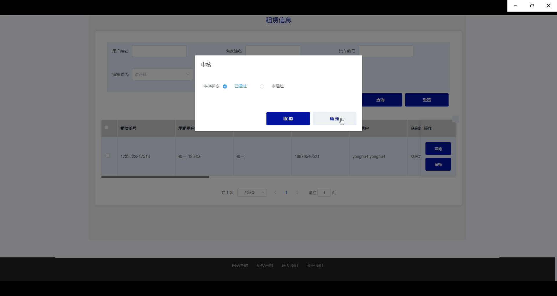 审核租赁申请功能由RentReviewController处理,控制器调用RentReviewService层的fetchPendingRequests方法获取待审核的租赁申请列表。Vue.js以表格形式展示每条申请的详细信息(如申请人、租期、车型等),租赁用户选择某条记录后,系统调用approveOrRejectRequest方法进行审核操作,结果即时反馈给用户和承租方。界面如下所示。