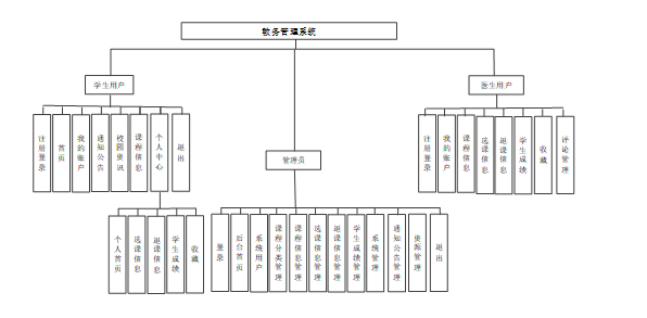Springboot教务管理系统设计与实现主要涉及有学生用户、教师用户和管理员三个角色。其中学生用户包含注册、登录、我的账户、通知公告、校园资讯、课程信息、个人中心等功能;教师用户包含登录、课程信息、选课信息、退课信息、学生成绩、收藏、评论管理等功能;管理员包含登录、后台首页、系统用户、课程分类管理、课程信息管理、选课信息管理、退课信息管理、学生成绩管理、系统管理、通知公告管理、资源管理等功能。每个角色对应的功能模块如图所示。