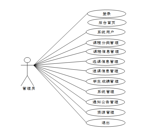 Springboot教务管理系统设计与实现中管理员包含登录、后台首页、系统用户、课程分类管理、课程信息管理、选课信息管理、退课信息管理、学生成绩管理、系统管理、通知公告管理、资源管理等功能。管理员用例图如下所示: