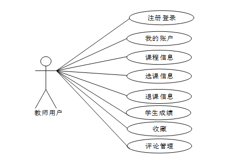 Springboot教务管理系统设计与实现中教师用户包含注册登录、我的账户、通知公告、选课信息、退课信息、学生成绩、收藏、评论管理等功能。教师用户用例图如下所示:
