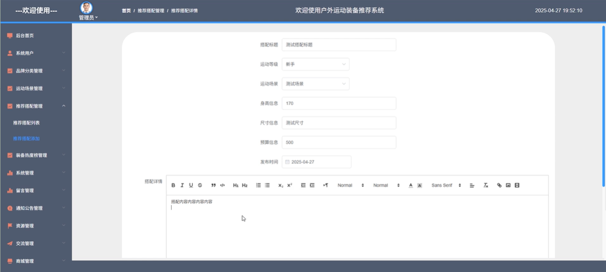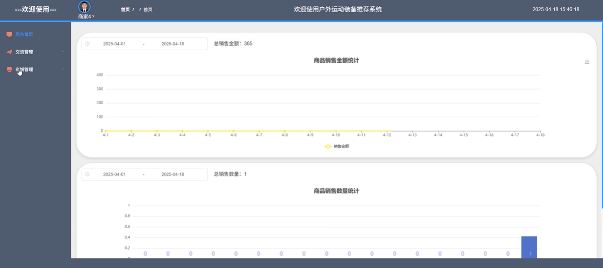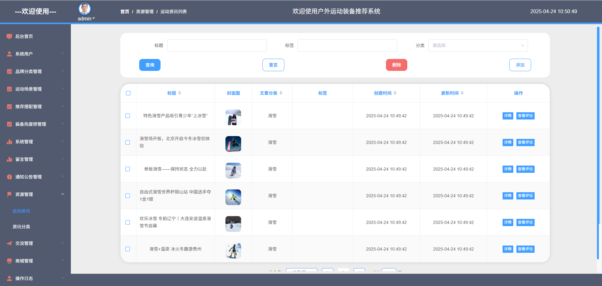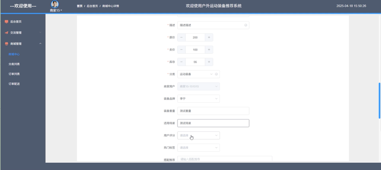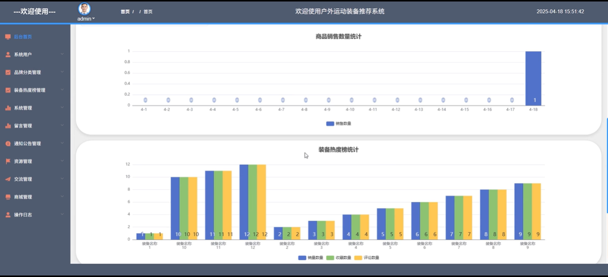 This system is an outdoor sports equipment recommendation platform based on the SpringBoot framework, dedicated to providing users with personalized shopping experiences through intelligent recommendation algorithms. After registering and logging in, users can view weather forecasts, equipment recommendations, sports information, and other content on the homepage, and interact with others through searches, likes, comments, and other activities based on their interests. At the same time, the equipment center uses collaborative filtering algorithms and combines users' historical purchase data to intelligently recommend relevant products, helping users easily find their desired products. Through order management, shipping address, shopping cart and other functions, users can easily complete the purchase and payment process.