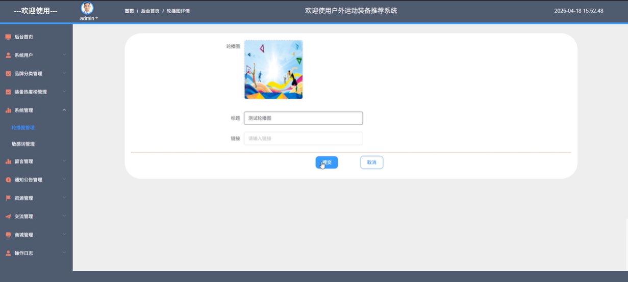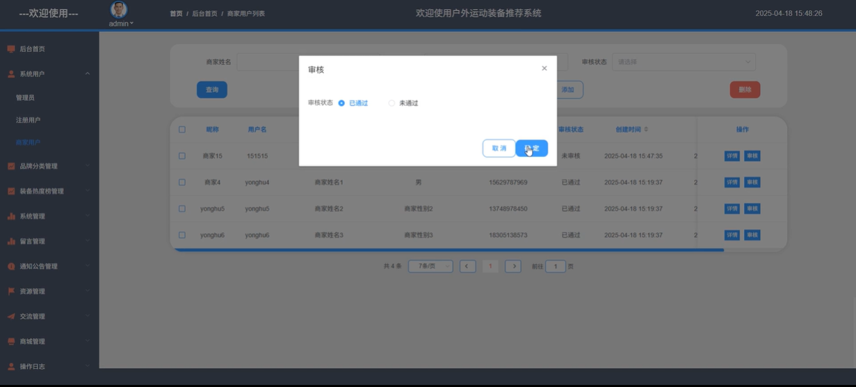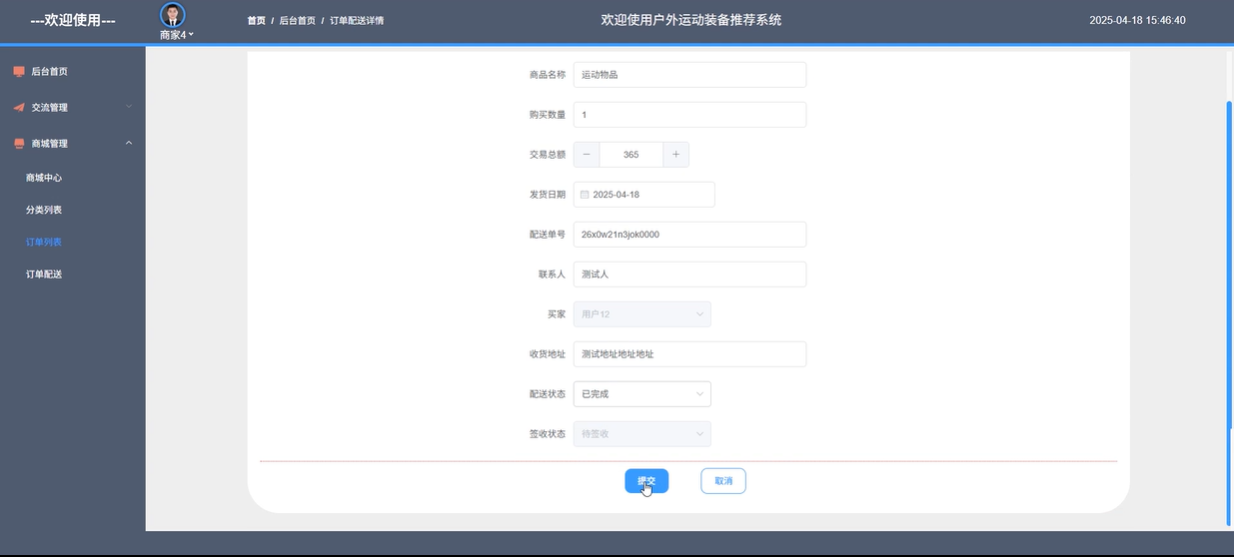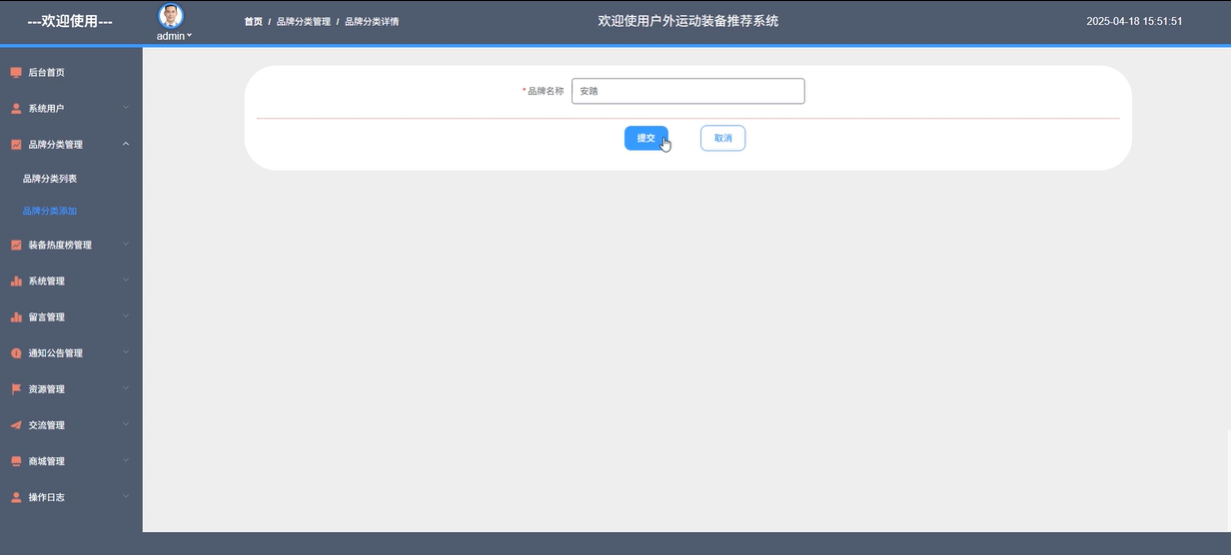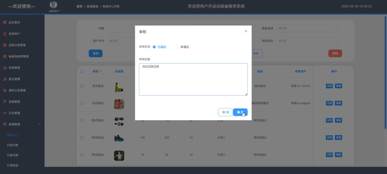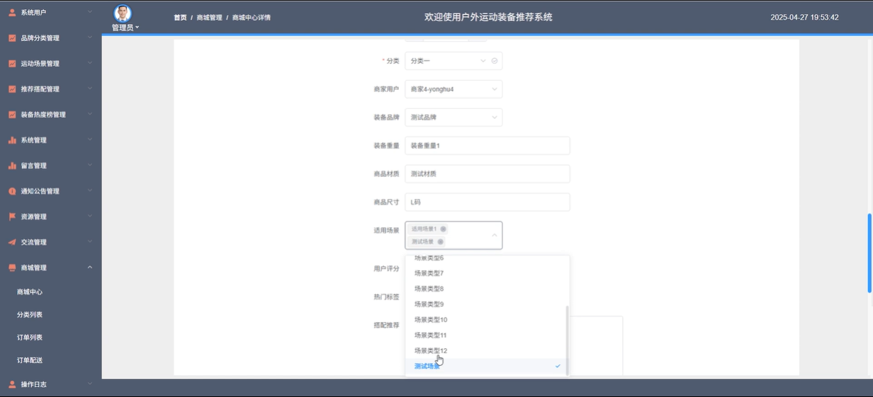 This system is an outdoor sports equipment recommendation platform based on the SpringBoot framework, dedicated to providing users with personalized shopping experiences through intelligent recommendation algorithms. After registering and logging in, users can view weather forecasts, equipment recommendations, sports information, and other content on the homepage, and interact with others through searches, likes, comments, and other activities based on their interests. At the same time, the equipment center uses collaborative filtering algorithms and combines users' historical purchase data to intelligently recommend relevant products, helping users easily find their desired products. Through order management, shipping address, shopping cart and other functions, users can easily complete the purchase and payment process.