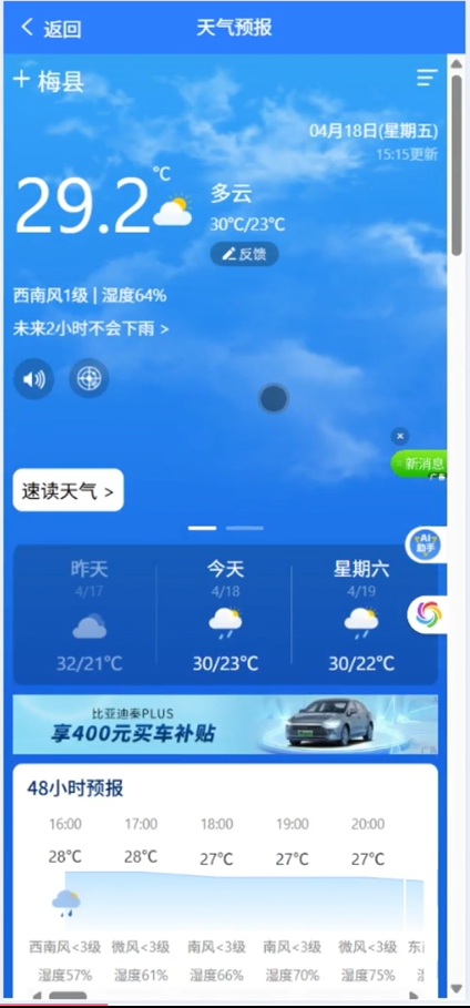 天气预报:用户可以在此功能中查看即时天气、48小时天气预报等详细信息。速读天气功能让用户快速浏览当天的主要天气情况,简洁明了。此功能帮助用户了解天气变化,方便安排户外活动。