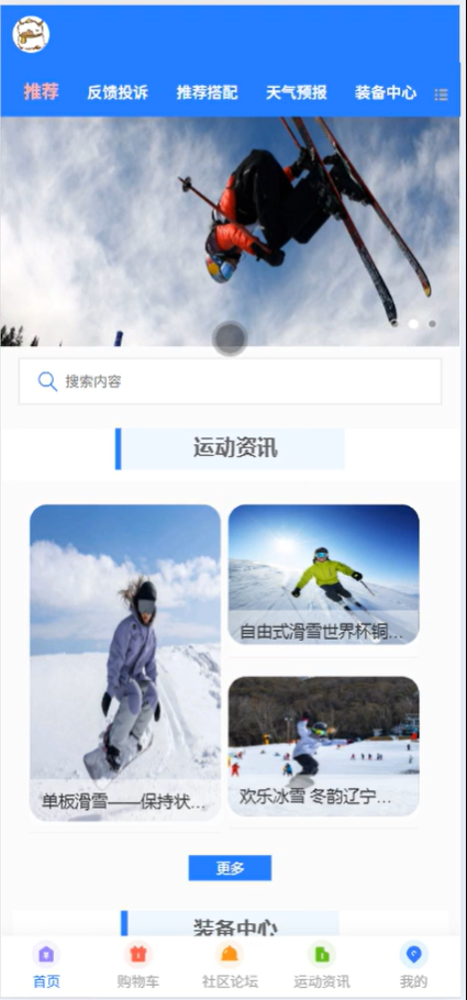 首页:首页展示了多种功能模块,包括天气预报、装备中心、运动资讯等。通过协同过滤算法,首页智能推荐用户可能感兴趣的装备,推荐内容基于用户点击和购买记录,推荐商品按分类点击量从高到低排序。首页还包含轮播图、导航栏、搜索框等,帮助用户快速访问所需功能。
