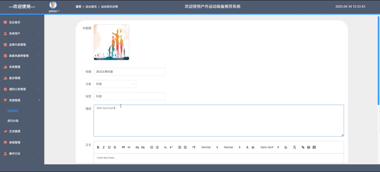 运动资讯:运动资讯模块提供了最新的行业动态、活动信息、装备推荐等内容。用户可以查看资讯文章的详细信息,进行点赞、收藏、评论、回复和删除等操作。通过搜索功能,用户可以快速查找自己感兴趣的资讯文章,保持与运动行业的紧密联系。