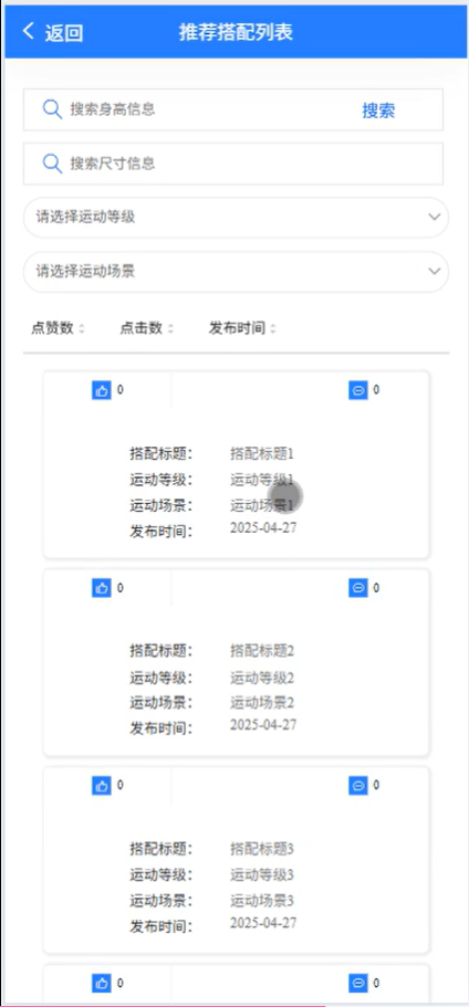 推荐搭配:用户可以查看详细的推荐搭配信息,包括搭配的标题、运动等级、适用场景、发布时间等。此功能还支持搜索功能,用户可以根据兴趣查找搭配内容。同时,用户可以对搭配进行点赞、收藏、评论、回复、删除等操作,参与互动并提供反馈。