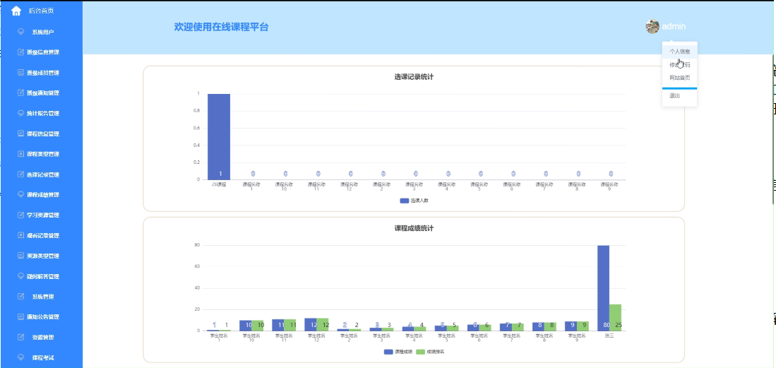 - 后台首页:展示选课统计图表、成绩分布图、试卷平均分等关键数据,以及管理员个人信息,帮助管理员快速掌握平台运行状况和用户活跃度。
