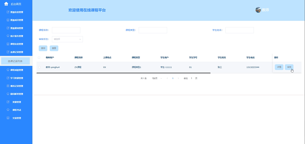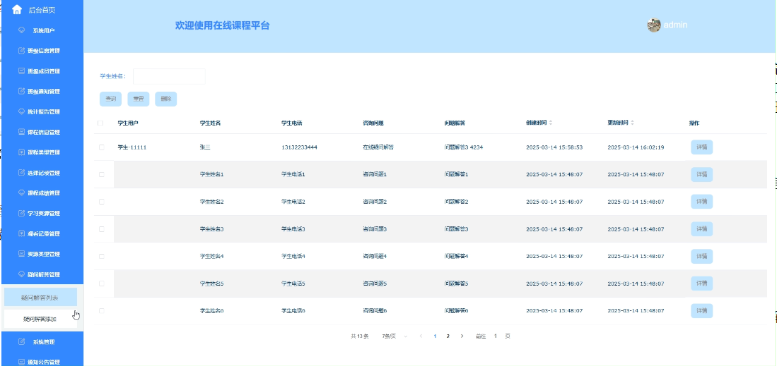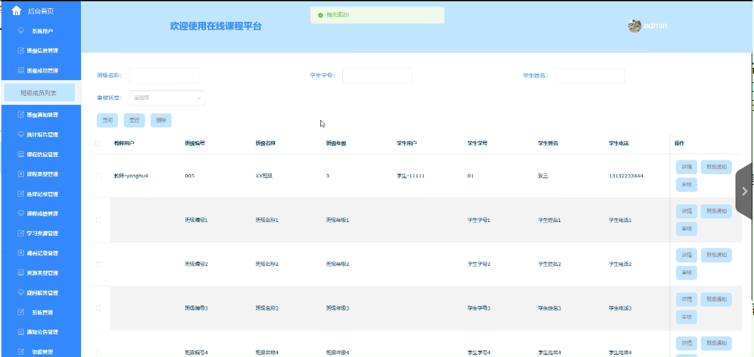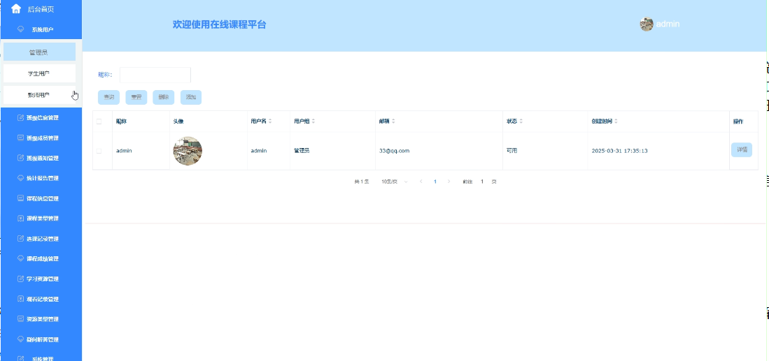 - 系统用户:包括管理员、学生、教师的查询、密码重置、删除、查看详细信息等操作,方便管理员对平台用户进行有效管理。