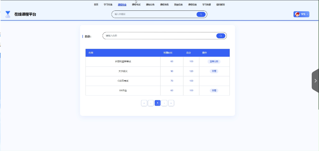 - 课程作业:用户可以搜索相关的课程作业,进行答题,并在完成后查看自己的分数。