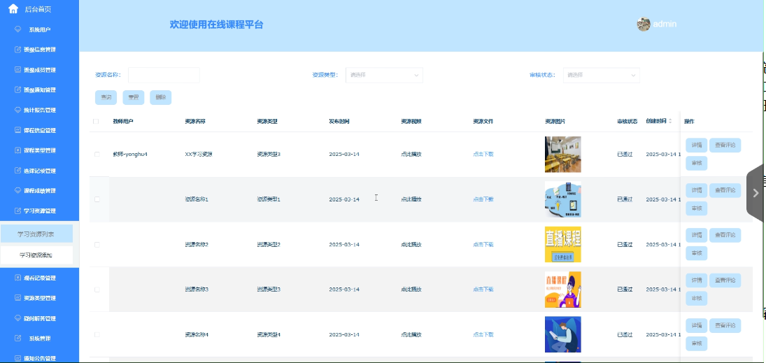 - 学习资源管理:提供学习资源列表、查询、重置、删除、详情、查看评论、学习资源添加等功能。教师可以为学生提供丰富的学习资源,丰富学生的学习体验。