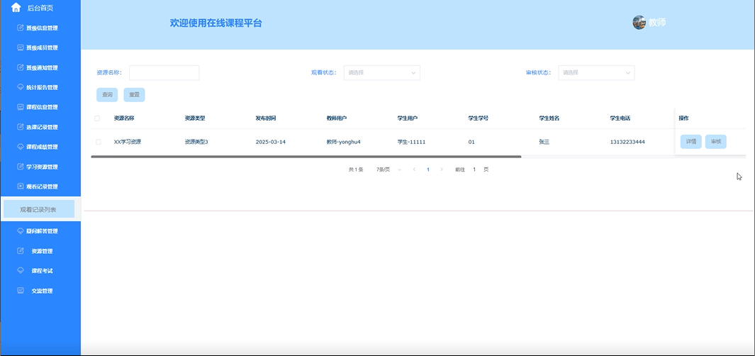 - 观看记录管理:提供观看记录列表、查询、重置、详情、审核等功能。教师可以查看学生的观看记录,了解学生的学习进度和兴趣点。