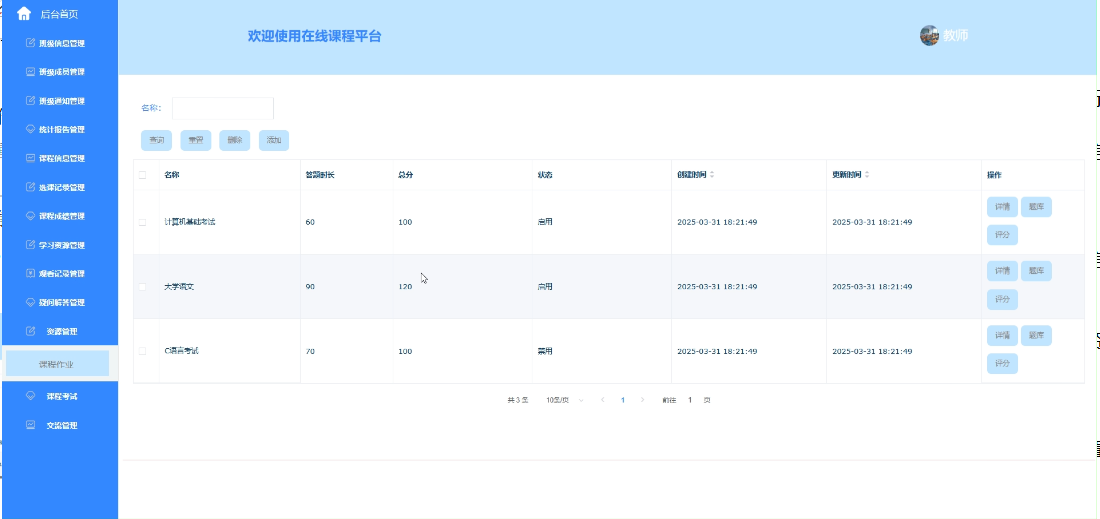- 资源管理:提供课程作业、查询、重置、删除、详情、添加、题库、查询、重置、删除、添加、导入、下载导入文档、评分、评语等功能。教师可以轻松管理课程作业和题库,为学生提供丰富的练习资源。