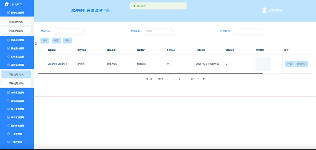 - 课程信息管理:提供课程信息列表、查询、重置、删除、详情、查看评论、课程信息添加等功能。教师可以轻松管理课程信息,确保课程内容的及时更新。