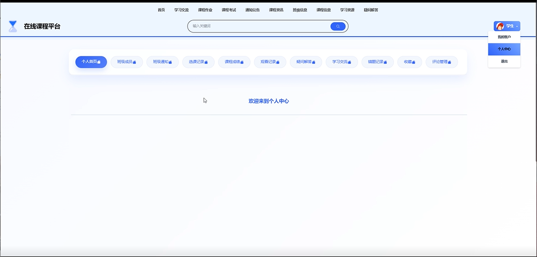 - 个人中心:用户可以访问个人首页,查看自己所在的班级成员列表,进行查询操作,重置个人信息,查看个人详情,接收班级通知,查看选课记录和课程成绩,管理观看记录,解决疑问,参与学习交流,查看错题记录,管理收藏的内容,以及管理评论。