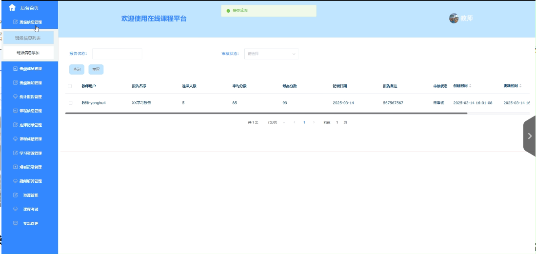 - 统计报告管理:提供统计报告列表、查询、重置等功能。教师可以生成和查看各类统计报告,为教学决策提供数据支持。