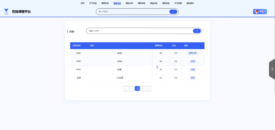 - 课程考试:用户可以搜索并参与课程考试,提交答案后,可以查看自己的分数,了解考试结果。