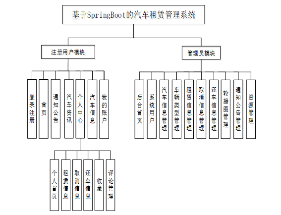 本文所设计和实现的基于SpringBoot的汽车租赁管理系统,旨在通过信息化手段提升汽车租赁业务的管理效率和用户体验。系统主要分为两个角色:注册用户和管理员。每个角色有不同的功能模块,具体功能如下: