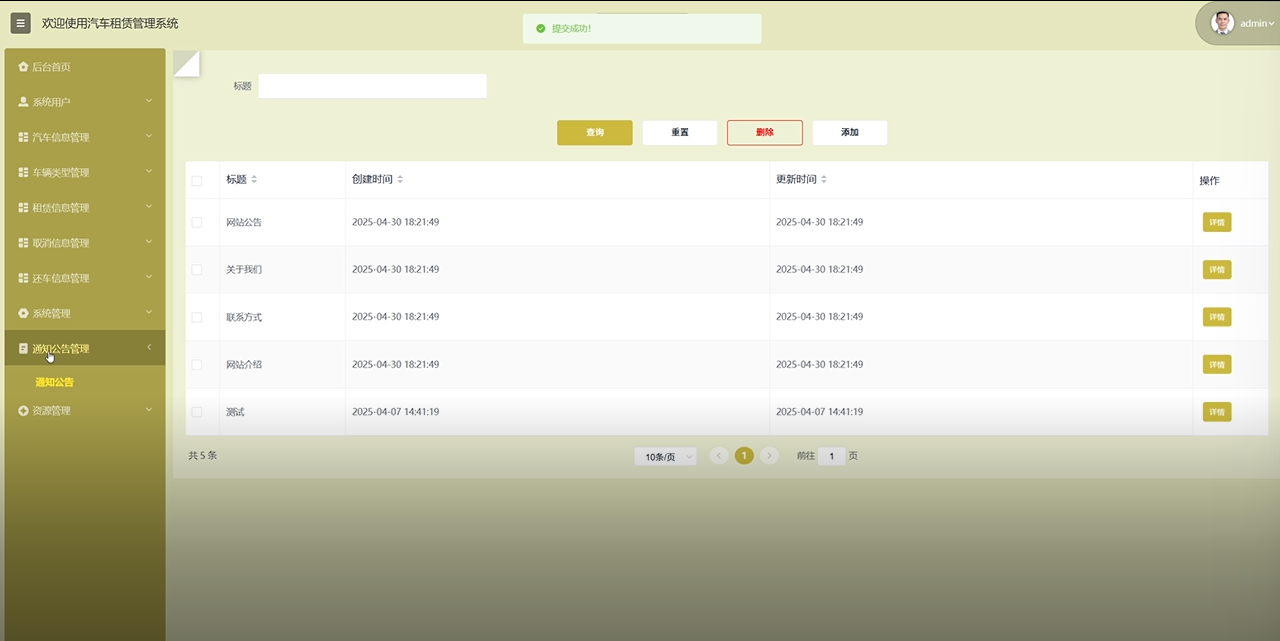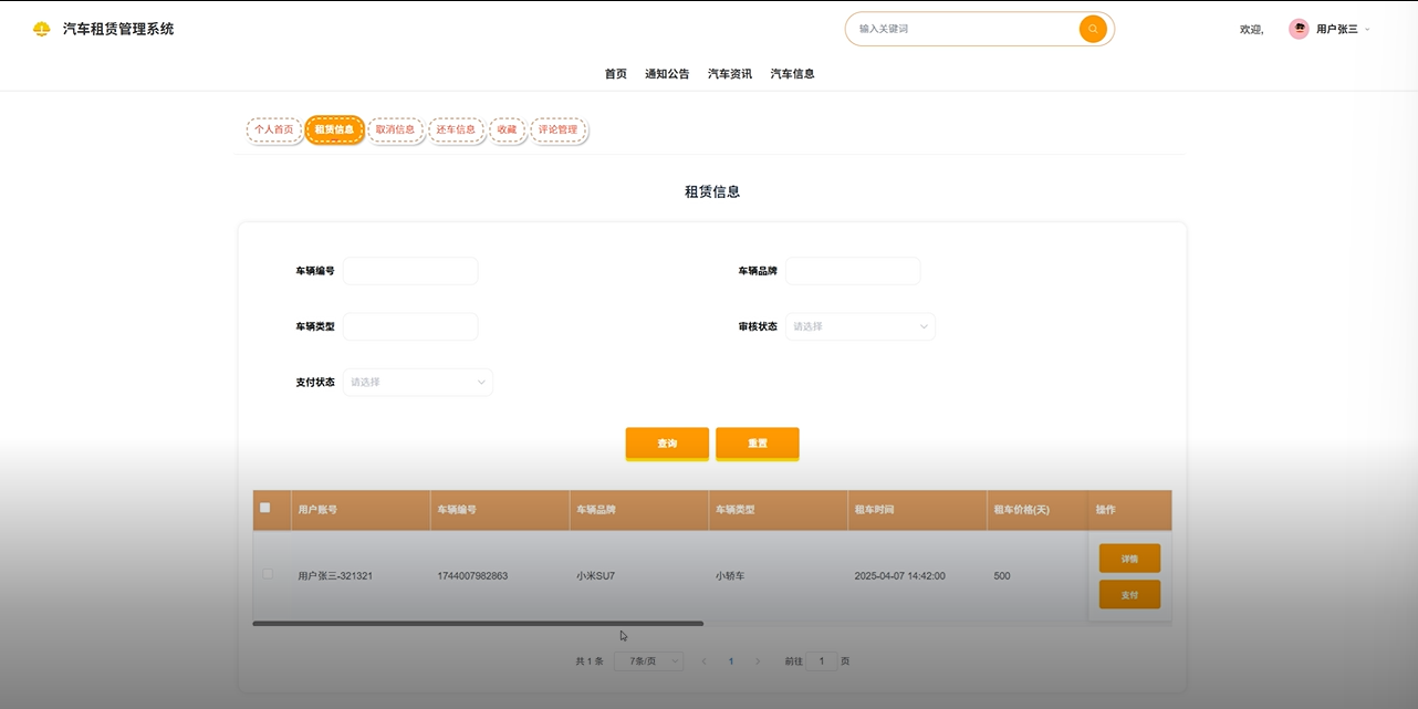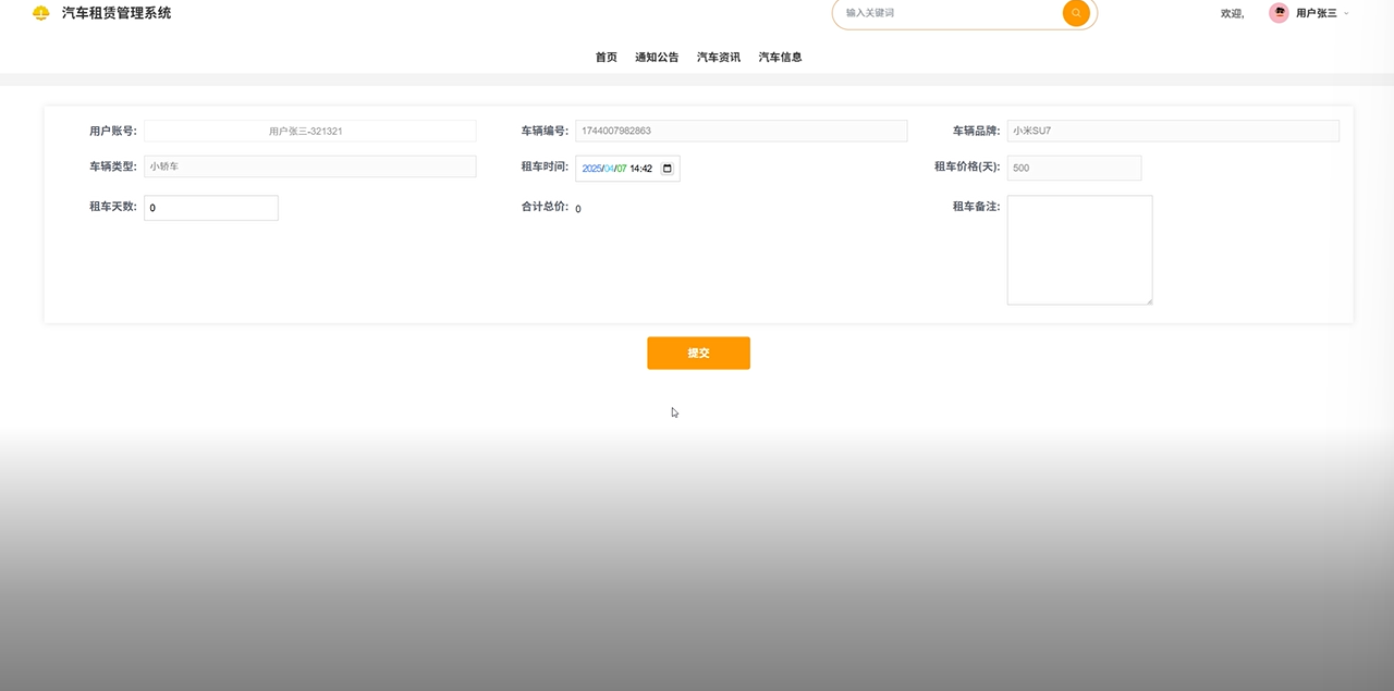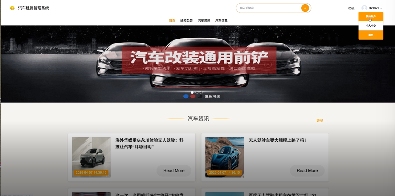 首页:登录成功后的首页展示了系统的核心内容,如热门车辆、最新租赁信息以及促销活动等。首页采用简洁明了的设计,帮助用户快速找到所需内容。