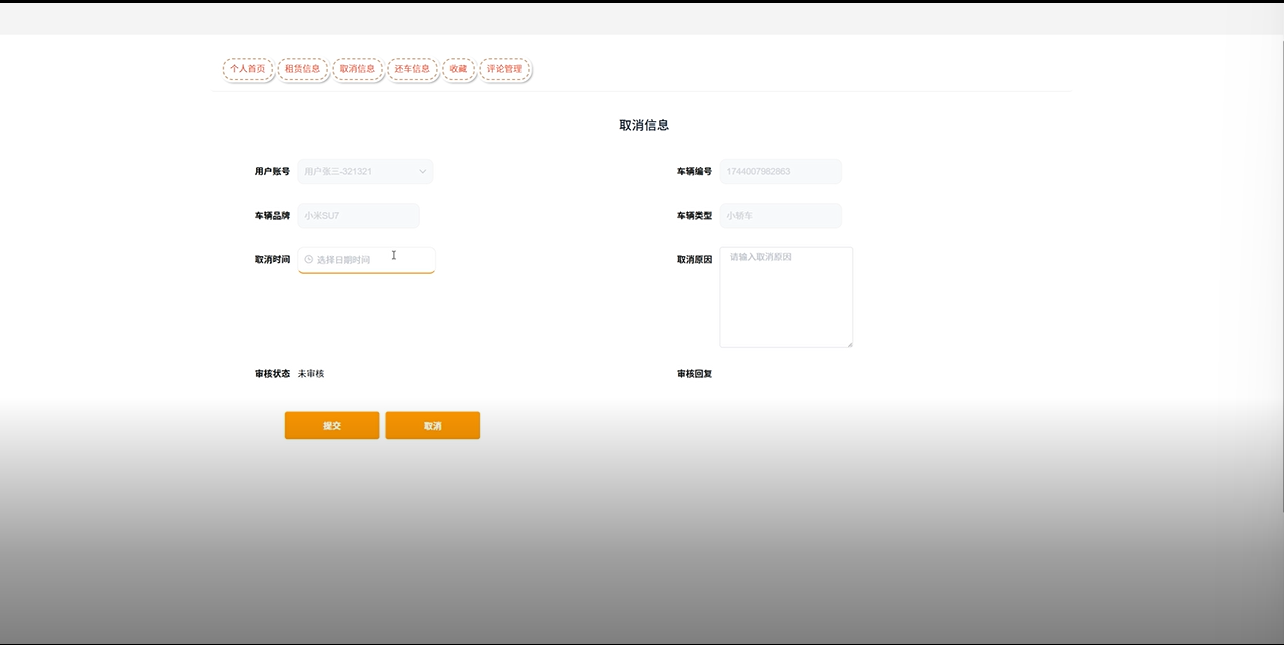 取消信息:如果用户需要取消租赁订单,可以在此功能中查看和管理自己的取消申请。