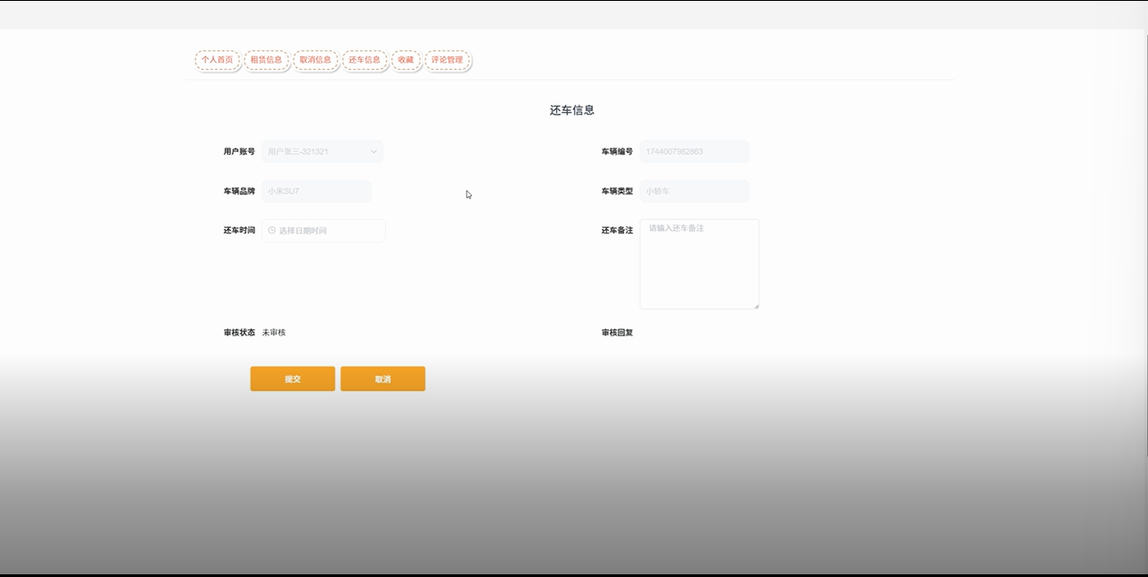 还车信息:用户可以查看和提交还车信息,系统会记录还车时间、车况检查等内容。
