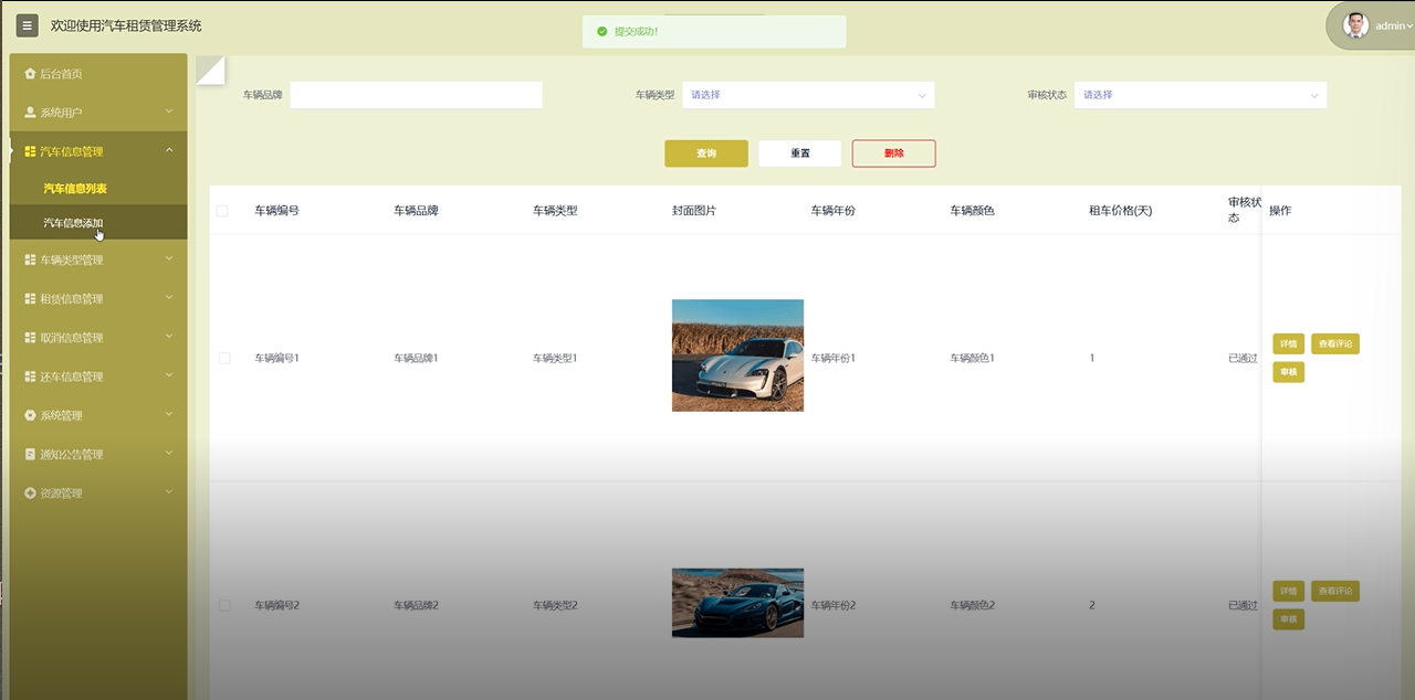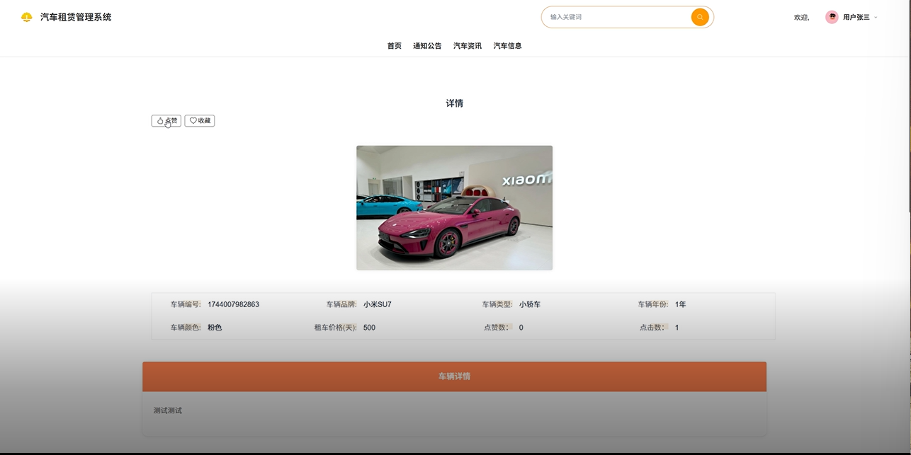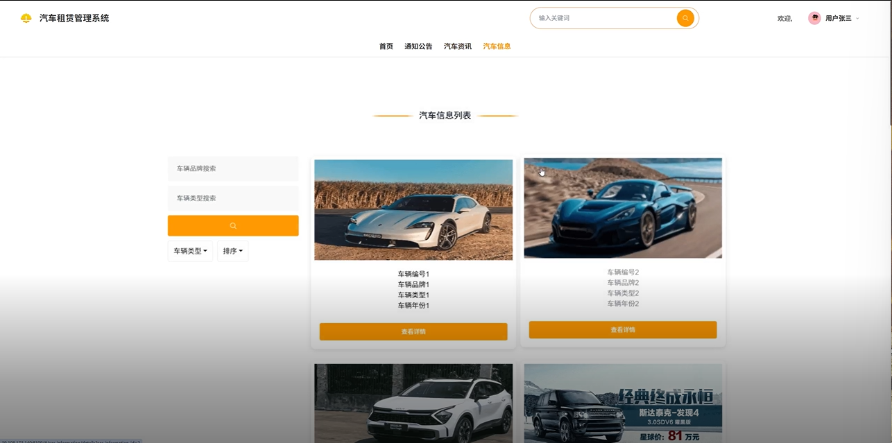 汽车信息:用户可以查看平台上可租赁车辆的详细信息,包括车型、品牌、价格、车况、租赁规则等。该模块提供了多种筛选功能,方便用户根据需求快速找到适合的车辆。