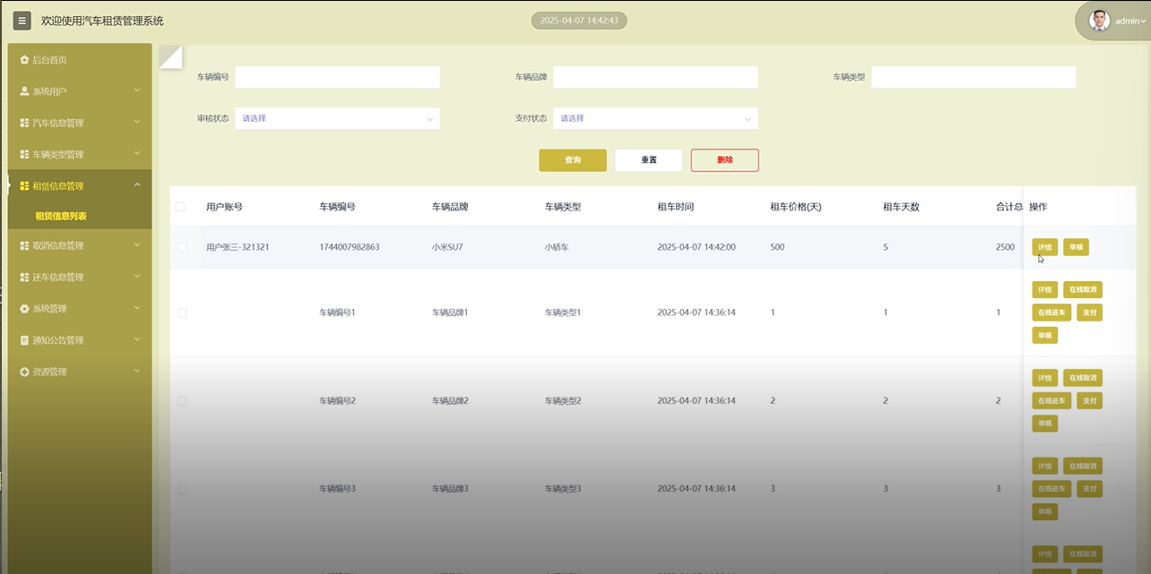 管理员点击“租赁信息管理”这一菜单,可以查看和审核用户提交的租赁信息和支付状态,还可以进行查询、重置、删除等操作。租赁信息列表界面如下图所示。