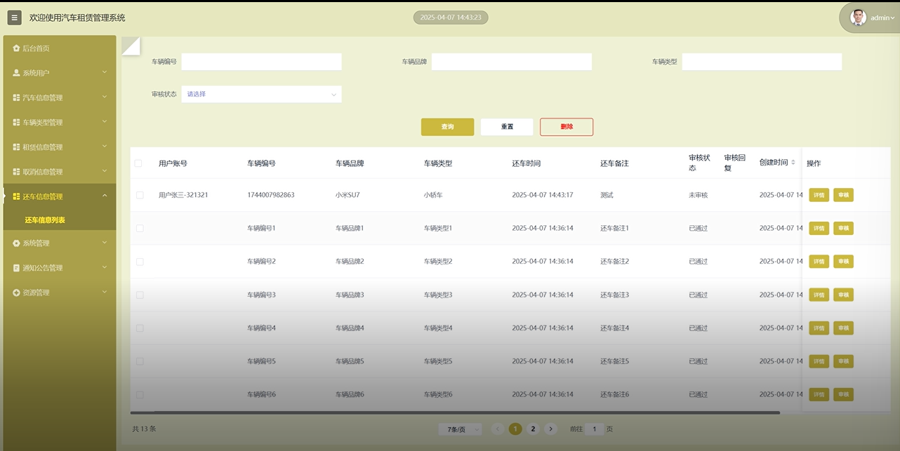 管理员点击“还车信息管理”这一菜单,可以查看并审核用户提交的还车信息,还可以进行查询、重置、删除等操作。还车信息列表界面如下图5-16所示。